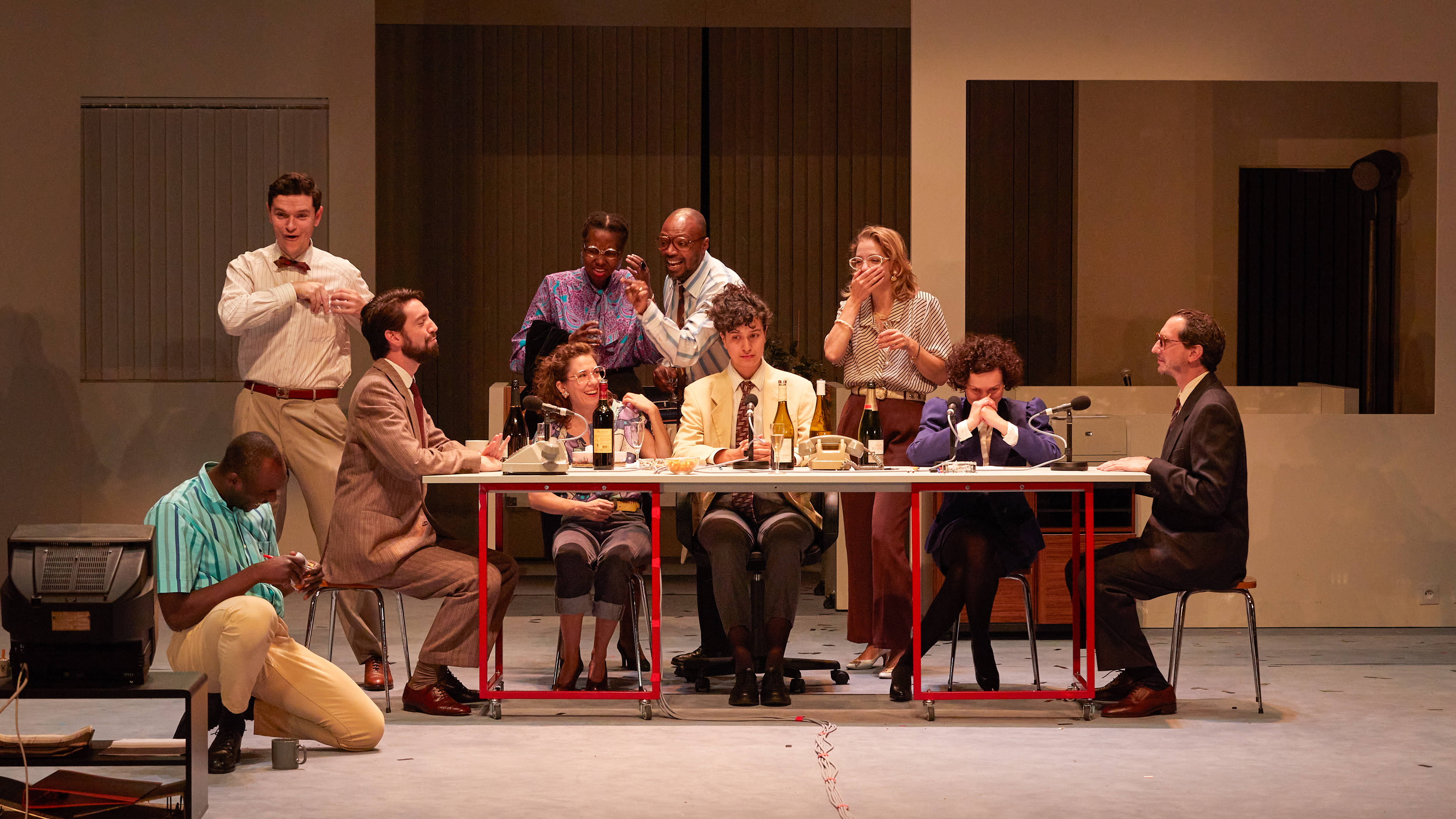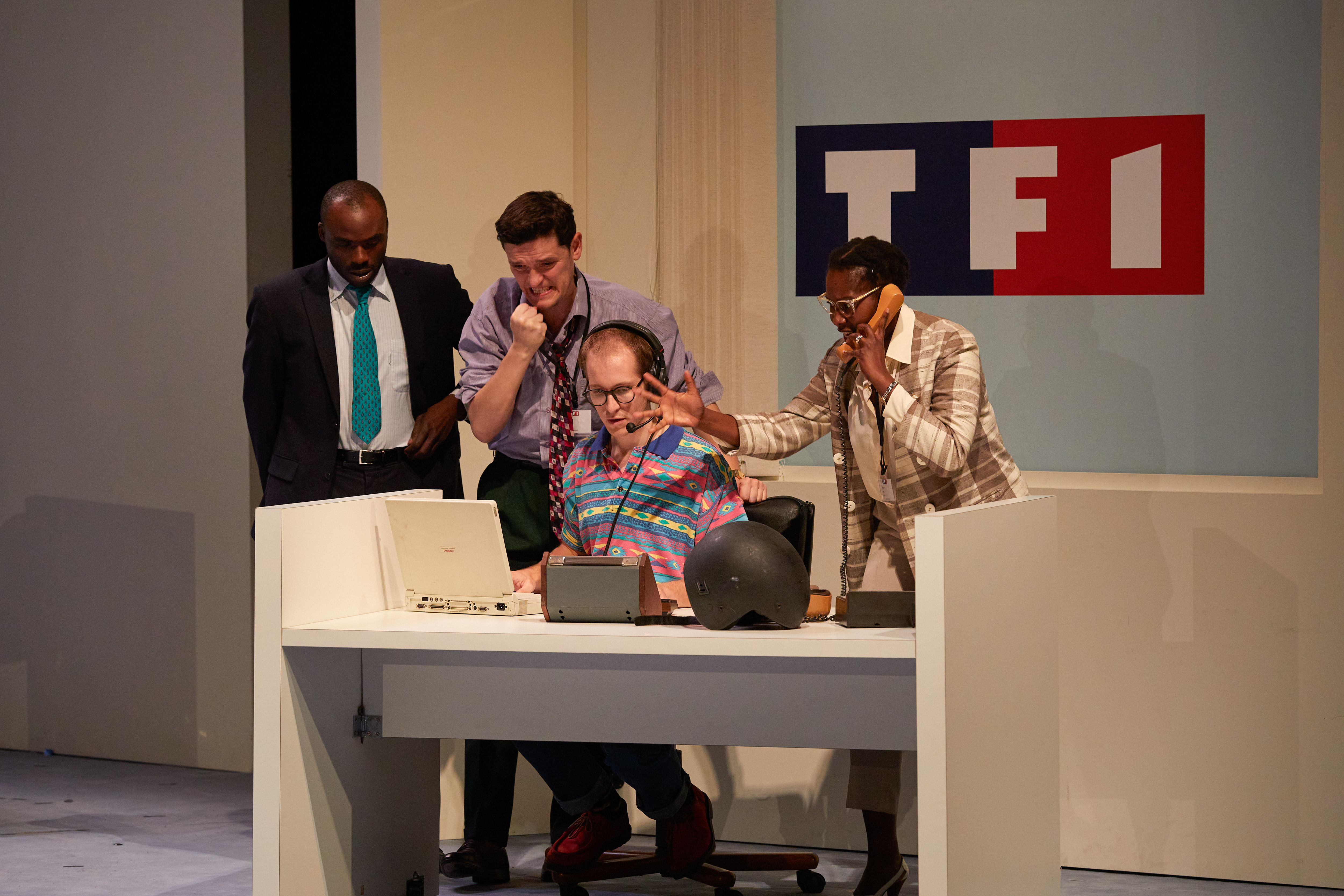 Fruit d’un long travail de recherche, de visionnage d’archives de l’INA, de rencontre avec les journalistes ayant traversé cette période, c’est une reconstitution fidèle des situations. Mais Thomas Quillardet ne fait pas de théâtre documentaire. Si toutes ressemblances avec des personnes et des évènements ne sont pas fortuites, Thomas Quillardet théâtralise avec raison l’ensemble. Pas de reconstitution à l’identique ni d’archive, de vidéo ou d’écran. Les codes qui régissent cette création dense sont avant tout théâtraux et reposent en grande partie sur les comédiens. Que Francis Bouygues soit joué par une femme et Claire Chazal par un homme, Jean-Marie Le Pen par un noir, sans que ni les uns ni les autres n’aient le physique ou la voix, importe peu, ça marche. Mieux même, cela induit une heureuse distance avec le sujet traité. D’autant plus que certaines archives incroyables, reproduites sans filtre, sont éminemment théâtrales et Thomas Quillardet n’a pas eu à pousser bien loin le burlesque pour déclencher les rires aussi jaunes soient-ils. Ainsi Francis Bouygues coaché par Bernard Tapie en vue de son audition pour l’attribution de la chaîne. Hallucinante scène et pourtant véridique. Qui se prolonge avec l’audition elle-même, vaste fumisterie où l’on promet, entre-autre, du Olivier Messian à une heure de grande écoute (sic). Ce même Tapie — devenu figure incontournable au regard de l’audimat — devant le refus ferme, compréhensible et honorable, d’Anne Sinclair d’interviewer Jean-Marie Le Pen, dépêché par la rédaction pour faire débat (1989). Pour qui s’en souvient, la séquence valait bien d’être reproduite. Cependant, et plus sérieusement, au fil des évènements qui traversent cette décennie, de Tchernobyl au Rwanda, de la chute du mur de Berlin à l’exécution des Ceausescu, c’est le traitement de l’information au regard de l’évolution de la chaîne qui devient le marqueur d’un bouleversement majeur où la concurrence avec les autres chaînes, l’audimat et la collusion avec le pouvoir, président au choix d’une rédaction désormais sous pression. Le licenciement de Michèle Cotta, directrice de l’information, fut à cet égard symptomatique. Thomas Quillardet fictionne fermement l’ensemble et son regard porte aussi sur les individus pris dans les rets d’un changement brutal et inattendu. Alors que le réacteur de Tchernobyl explose, la rédaction inquiète est près d’imploser. Pour chacun vient l’heure d’une remise en question. Non sans ironie, une fois acté la vente, Thomas Quillardet fait chanter, le plus sérieusement du monde, le générique du feuilleton Dallas, feuilleton emblématique des années Bouygues. Les ambitions se révèlent et les coup-bas qui vont avec, se défont les amitiés et s’organise la résistance. Il y a là toute une humanité désorientée qui bientôt se réorganise en fonction de ses intérêts, les sentiments s’avérant parfois tragiquement réversibles.