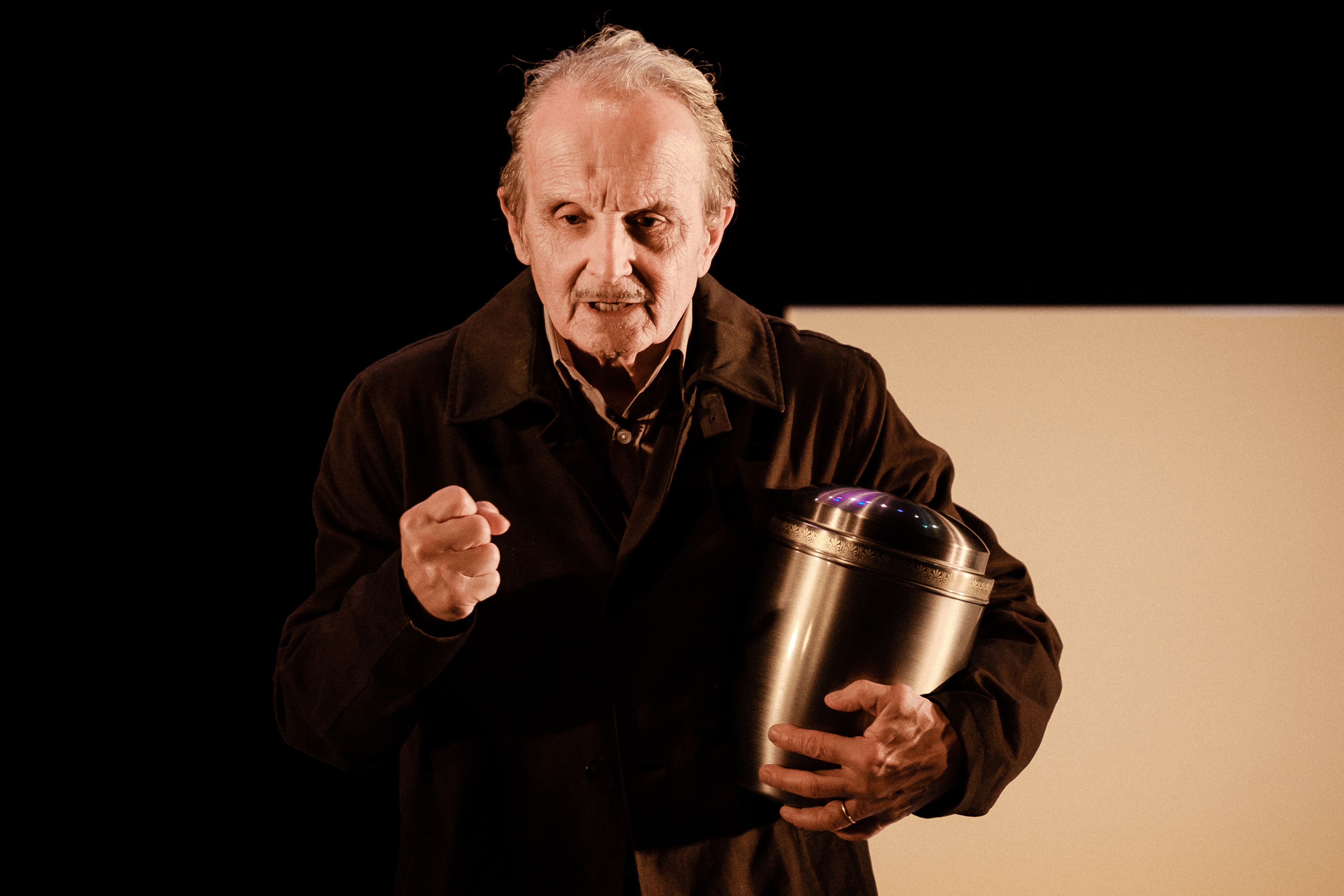 C’est un poème d’amour d’un père à son fils, un tombeau pour un défunt, travesti et prostitué suicidé, noyé dans les eaux du Lambro. Long monologue pour retisser les liens rompus, dire enfin ce qu’on n’osait se dire, partager un dernier instant d’intimité. Là, sur ce quai de gare, entre Milan et Turin, l’urne dans les bras, tenue comme on tient délicatement un enfant, le père se confie, dit sa douleur avec pudeur, ses regrets pour ne pas avoir compris, ou ne pas avoir voulu comprendre, fait parler les proches, la mère acariâtre et injurieuse, la sœur scandaleuse, les piliers de bars… A ce fils surnommé « La vierge bienheureuse », il offre un ultime et singulier conseil : de garder ses chaussures de femmes, « ses cothurnes », et sa robe rouge en velours pour traverser le Styx, cela ne pourra que plaire « à la commissions des grecs », ceux là qui préside aux enfers. Antonio Tarentino, disparu en 2020, qui fut sculpteur et écrivain, signe un texte où l’humour et le tragique, ce qui revient parfois au même, se disputent, où la poésie se fait parfois burlesque, où enfin la naïveté populaire fait s’embrasser le profane et le sacré. Une langue musicale pour un chant d’adieu, une dernière et douce-amère berceuse, un soliloque consolatoire. Antonio Tarentino sculpte la langue avec une précision inouïe et sans nul doute fait-il remercier Jean-Paul Manganaro pour la traduction. Paul Minthe est ce père en deuil. L’écriture d’Antonio Tarentino, il la connait intimement, lui qui offrit à Jean-Yves Ruf l’opportunité de créer en 2010, La Passion selon Jean, du même auteur. Paul Minthe s’approprie cette écriture, dans ses pleins et ses déliés, fait corps avec elle pour une incarnation toute en nuance, d’une grande délicatesse. Sans jamais en faire trop, bien au contraire, il est à vif, petit homme écorché, bousculé par une chienne de vie, rentrant sa peine, son chagrin suintant à bas-bruit. Un jeu extrêmement ténu, expression d’une pudeur déchirée, ravalée, d’un père se dévoilant devant son fils. Rien ne sert de préparer ses mouchoirs pour autant, l’humour, même teinté d’horreur, donne grâce et légèreté à cette oraison profane et vespéral pour un enfant défunt. Jean-Yves Ruf s’efface derrière le comédien, dirigé avec soin c’est certain, assuré sans doute devant cette appréhension, cette intelligence de l’écriture de Paul Minthe. Tous deux ayant grand soin de s’estomper derrière le verbe d’Antonio Tarentino, car c’est bien lui, ce verbe baroque, qui est ici mis en scène avec bonheur. C’est un théâtre réduit à son essence, un texte et son interprète, rien de plus, rien de moins. Et c’est bien.