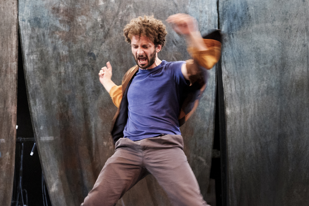 Jean Bechetoille signe et met en scène une pièce sacrement  tordue, entre tragédie et comédie, quelque peu loufoque malgré le sujet où rien de ce qui advient d’étrange, Shakespeare oblige, ne vous déroute. Explorant les névroses familiales, le traumatisme d’un deuil, le déni face au suicide, cette sidération qui vous empare, il se refuse cependant à tout pathos et distille un humour à froid qui réchauffe le tout. Et c’est bien. Toujours une juste et heureuse distance pour ne jamais plomber l’ensemble. Pas de larmes mais des hoquets de rire le plus souvent. C’est très subtil et finement amené. Une écriture parfaitement ciselée et précise qui se fait parfois merveilleusement poétique. Ah, les monologues du chien ! Parce que ce chien-là a la parole et quelle parole ! Ce chien-là c’est quelqu’un, comme dirait Raymond Devos,  et qui concentre en lui toute l’humanité, toute la fragilité, toute la bonté, voire l’innocence, qui manque à cette famille en déroute, percluse d’incompréhension et de violence, ensuquée dans son traumatisme et le déni. Mise en scène vive, alerte, sans temps mort, une ligne claire et droite faisant fi d’une chronologie des faits quelque peu secouée, Shakespeare oblige, s’amusant même de ces allers et retours spatio-temporels jamais inutiles pour la compréhension de cette pièce quelque peu cathartique. De belles idées de mise en scène, toute bêtes. Et l’ensemble est mené tambour battant, d’un même élan énergique par une troupe dirigée au cordeau qui s’empare de cette langue et de chaque personnage avec une gourmandise certaine. Ils s’amusent, le plus sérieusement du monde, tout à leur personnage, chacun à leur manière complétement cintrés, monstrueux même. Et pas de surenchère, jamais, dans la monstruosité. Terriblement humain, trop humain même dans leur névrose avec une part de mystère jamais vraiment dévoilé qui intrigue et leur donne une épaisseur certaine. On les sent jubiler de défendre cette pièce singulière et cette langue pointue, si précise. Voilà une création qui a sacrement du chien. Et quel chien (aussi) !