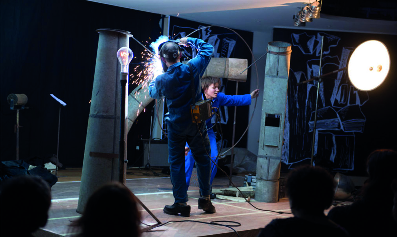Volia Panic se construit au plateau, à l’instar du cosmisme, dans un ingénieux bricolage hétéroclite : faisant feu de tout bois, assemblant tuyau de poêle, courroie, engrenage, échafaudage de bric et de broc, la fusée se fabrique sous nos yeux. Il y a avant tout de l’artisan dans l’art comme le proclamait religieusement Romeo Castelluci dans son récent Vita nova. Volia Panic déborde de cette machinerie humaine, de cette pensée industrieuse qui en passe autant par l’esprit que par les mains, proprement dionysiaque.