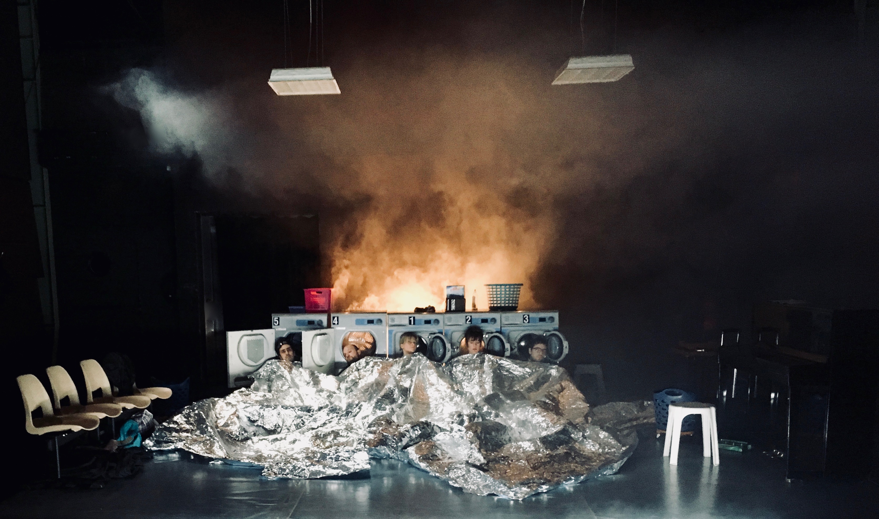 Avec Voyage Voyage, inspiré du célèbre poème de Baudelaire Le Voyage, l’idée première était de parler de ces gens en mouvement, physique et intérieur, qui semblent chercher leur place et une brèche d’exotisme dans le banal. Cela donne naissance à une guirlande de personnages drôles et touchants. Des caractères imaginés comme autant de solitudes isolées allant bientôt se rencontrer. Être seul ensemble. Où ? Dans un non lieu. Ou plutôt et très précisément dans un lavomatic, ces endroits de passage hors de toute dimensions, et où ces machines à laver ressemblent étrangement à des machines à transformer et à tromper le temps. La scène et l’espace deviennent ainsi un puissant poème aux courbes énigmatiques de récits pluriels et ouvert d’imagination débordante. Comme dans un rêve, les vapeurs de ces personnages en transit entourent la scène d’un univers fort et singulier où mille et une histoire s’entrelacent. Parmi elles : un chef d’orchestre de tournée mondiale dont la gloire semble être passée et qui écoutent ses propres concerts à la radio tout en s’accompagnant au piano ; une hôtesse de l’air aux ailes brisées par l’attente, un écrivain on the road qui semble un mauvais Kerouac puant la ringardise, une femme errante sous la pluie vagabonde d’insomnies, et un homme au charmant accent du sud obsédé par les oiseaux migrateurs et essayant de tromper sa solitude et son amour d’antan.