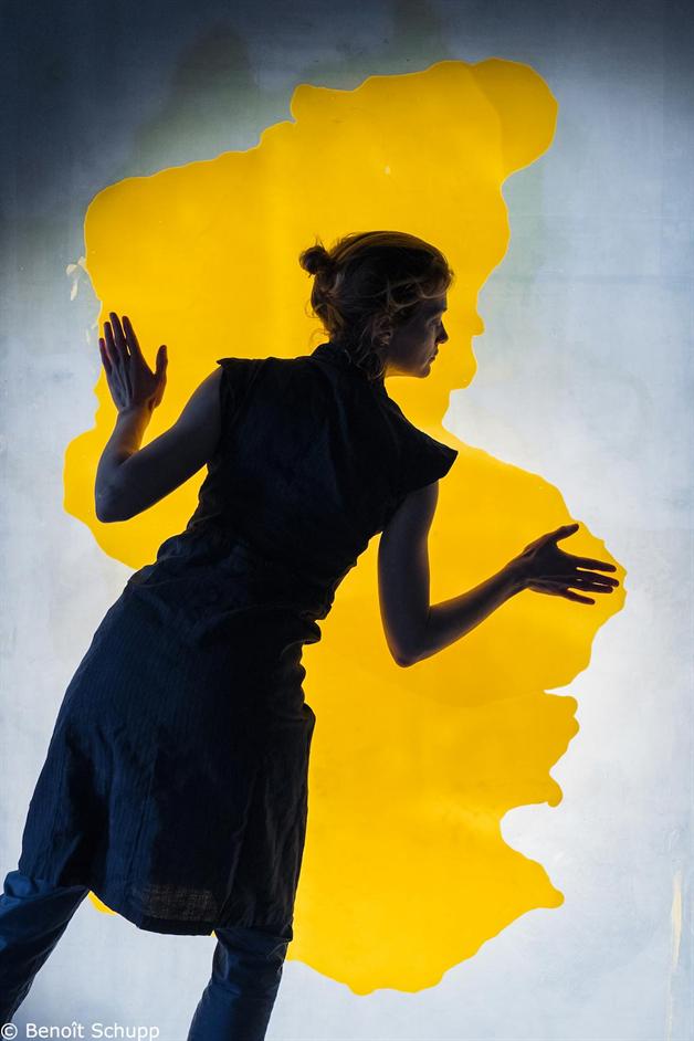 De la cire donc et rien que de la cire ! Comme scénographie, comme prétexte et comme partenaire de jeu ! Rien d’autre que la fébrilité de la découverte et l’interaction imprévisible avec cette matière, changeante s’il en est ! Changeante, sur le qui-vive de la plante des pieds au chignon du sommet de sa tête, prête à la surprise, Justine Macadoux (qui était ce jour-là sur scène) n’est pas en reste. En robe-tablier et lunettes de protection, elle nous fait verser dès l’entrée dans un atelier et dans l’état d’enfant. Sa posture, ses gestes et son mouvement effervescent et transparent aux émotions incarnent, de façon si réaliste que cela en est troublant, un personnage qui semble n’avoir pas même 2 ans, puis peut-être 5 ou 6. Et c’est troublant justement parce que ce n’est pas de l’illustration ou de l’imitation mais une transformation, « à la manière de ». C’est parce qu’elle se laisse prendre par l’état d’esprit de l’enfant que son jeu est si juste. Le personnage de Justine/Stéphanie est une bénédiction. Exempt de tout stéréotype, notamment genré ou moral, il échappe aussi à la cartographie usuelle des contes pour enfants, et c’est vivifiant !