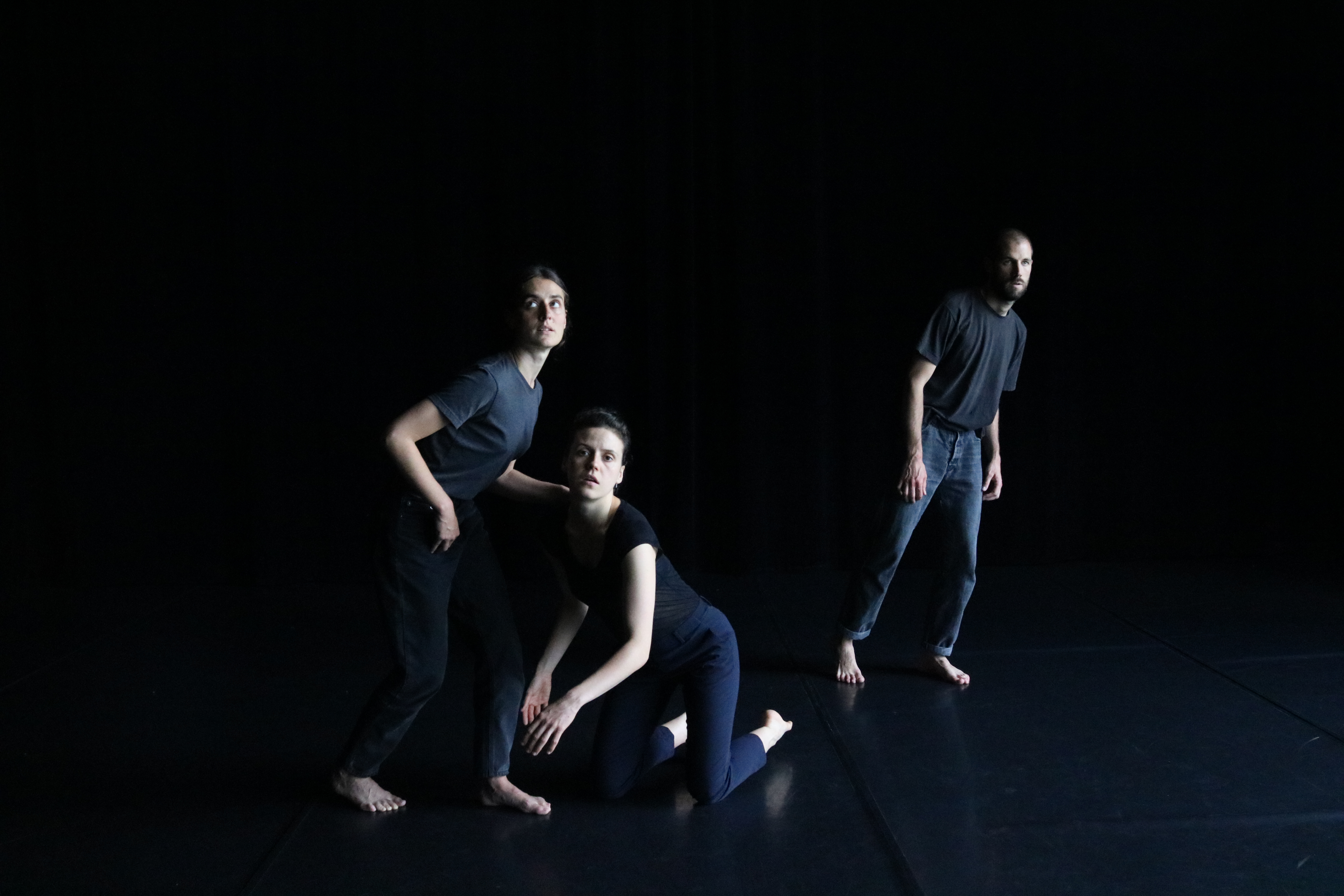 C’est un trio. Non pas de choc, car ils sont immobiles, ou presque. Ils ne portent pas le maillot jaune, mais un sous pull canari. Quand certains ont du chien, eux tirent plutôt du côté de l’oiseau, avec cette façon de mirer sans dévier d’une pichenette, à s’écarquiller le blanc et sa pupille. Ils sont une énigme posée sur un immense drap blanc tombant des cintres formant une insaisissable courbe alliant la verticale à l’horizontale. Tandis que le public s’installe, leur statisme dans des équilibres périlleux, la fixité de leur regard et l’impassibilité de leur visage étonnent. Aussi subrepticement que des mouvements infimes ont lieu, sans que l’on puisse déterminer à quel moment ils ont débuté, des voix commencent à se faire entendre. Dieu, me voilà pucelle d’Orléans ? ! Ne jurons pas, ce serait faire injure à la magie de la ventriloquie dont sont experts le larron et les deux larronnes.