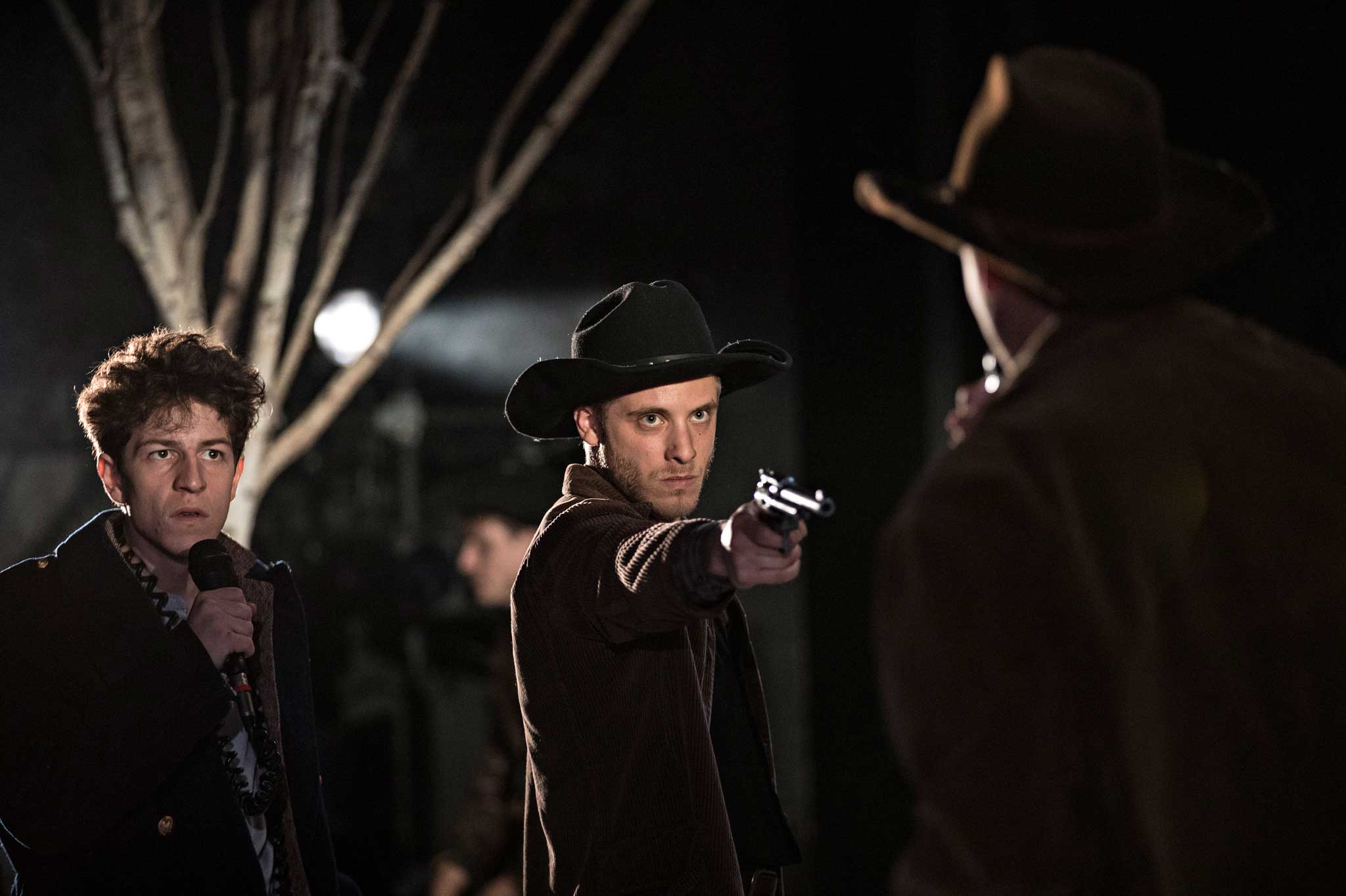 Une histoire somme toute alléchante et qui nous renvoie dans les jeux extraordinaires de l’enfance. On aurait pourtant souhaité que cette jeune équipe d’acteurs, tous sortis de la promotion 42 de l’école de TNS, soient dirigés avec ce même goût pour l’aventure et ce ludisme qui consiste à jouer au cowboy. C’est malheureusement une autre tournure que prend ce spectacle… Trop de distance se dégage de cette tentative pourtant très intéressante et audacieuse : le western à Montreuil, le cinéma au théâtre, l’anglais transposé en français, les rôles féminins et masculins se confondant etc. Une distance qui certes aurait pu être intéressante, mais qu’il aurait mieux fallu traiter autrement, notamment en assumant le décalage des contre-emplois qui vient se proposer à ces jeunes comédiens, et qui aurait sans doute apporté beaucoup d’humour à cette mise en scène. On trouve malheureusement bien des maladresses dans cette épopée chevaleresque, bien qu’une dramaturgie musicale solide fouette l’action et amène un rythme vigoureux.