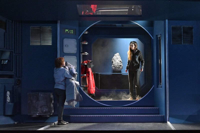 Le rideau se lève sur un tableau in medias res avec une mention spéciale pour la scénographie qui a soulevé un murmure d’admiration : l’espace entier du plateau transformé en véritable décor de cinéma plante la salle commune d’une station spatiale. La Terre mystérieusement ne répond plus, on se demande « depuis combien de temps »… On est dans l’orbite de Pluton, bel et bien aux portes des enfers version 2.0 ! Espace confiné, ambiances sombres aux lumières soignées, ergonomie à géométrie rétrofuturiste. Les seules ouvertures potentielles vers un ailleurs sont le sas de décompression, le poste de communication en parfait état de marche mais qui reste muet, le hublot désert et le congélateur…, autant de voies donc vers le néant.